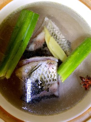 取一只砂锅,添上温水,将煎好的鱼放进去,调料放入,大火煮开后转小火慢煲