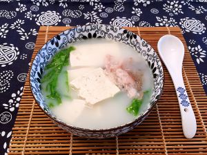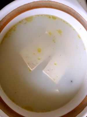 煲汤的当儿,将豆腐切一厘米厚的片,放入锅中汆一下水,去除豆腥味儿