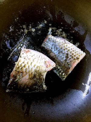 锅中放油,鲫鱼煎至两面金黄后,捞出控油。