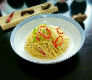 捞出放盆里后根据自己的口味放入辅料就可,美味的酸辣土豆丝做好了