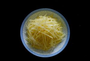 清水洗一遍土豆丝后再用清水泡一阵子,让土豆丝里的淀粉洗掉,这样处理过的土豆丝吃起来才会脆。