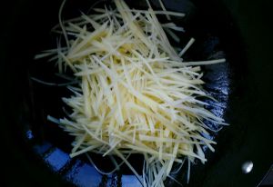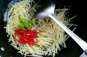 热锅热油放辣椒进去,把控干的土豆丝倒进去快速翻炒。