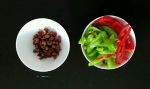青红椒切丝。土豆洗净淀粉,沥干水分备用。