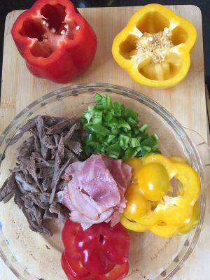 在上面放上第二层食材,红黄辣椒圈,牛柳,培根,并且撒上黑胡椒