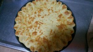 将烤箱180度预热,把发酵好的面排气后,擀成饼状,上面扎些孔,放到烤箱里10分钟,披萨皮成功。