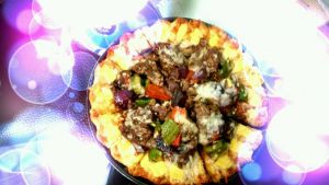 将饼皮上放些番茄沙司,铺层芝士,把炒好的料铺在上面,(我稍微做了个芝士边,忘记照了)再铺层芝士,放进烤箱180度5分钟。