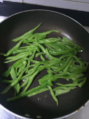 2块牛排切成细条,三四个二荆条辣椒切段。