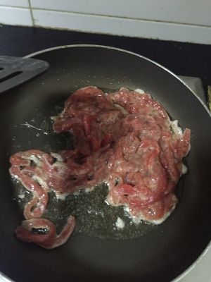 热锅冷油,小火,加入蒜片炒香,改中大火,放入牛排条炒至变色(八九成熟即可),放入杏鲍菇条。