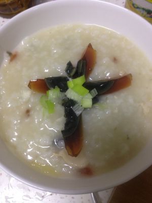 出锅时,将另一个皮蛋放入,再撒上葱花,点一点香油。