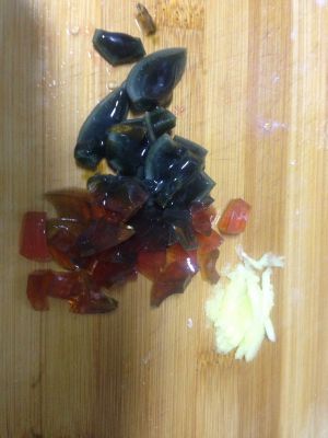 熬白米稀饭,米开花,汤略稠时放入姜丝、皮蛋碎(一个皮蛋切碎,另一个出锅用)