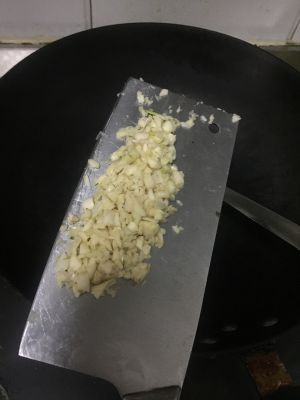 倒入剁碎的蒜蓉, 继续翻炒1分钟。