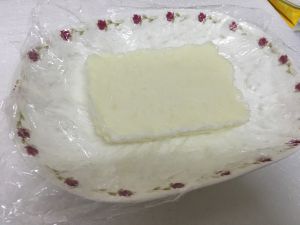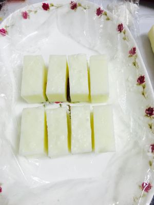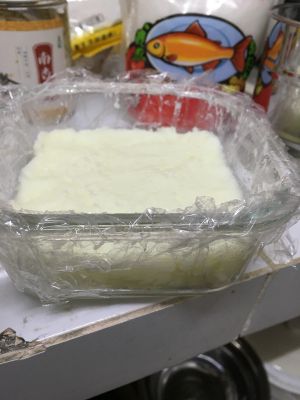 放凉然后放入冰箱冷藏好,取出牛奶块,我用了400g左右的牛奶,奶糊做多了,弄了两大盒