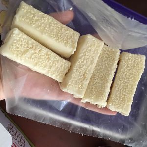 包好的牛奶条,上面一层涂上一层水,然后撒上芝麻,可以冻冰箱里,下次想吃拿出来炸了