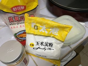 准备原料 玉米淀粉 白糖 牛奶,面包糠
