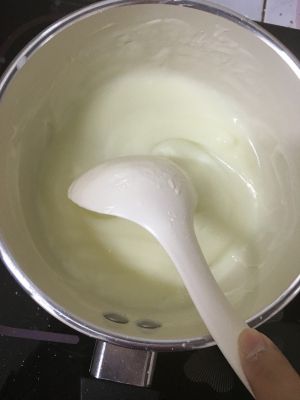 倒入锅中,小火加热。一边加热一边一个方向搅拌,搅拌至粘稠时离火。