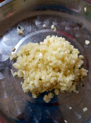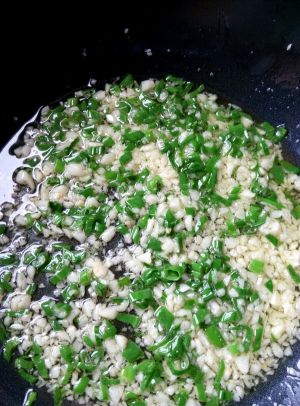 然后把油倒在平底锅里面,放上蒜翻炒一下,炒到微黄
