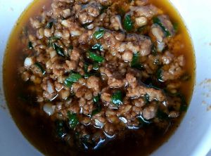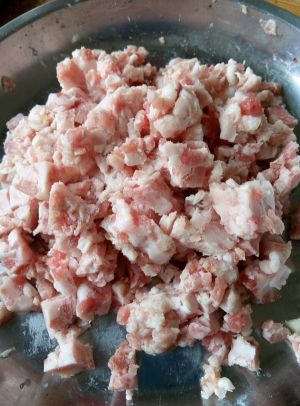 把五花肉同样切碎,如果嫌弃五花肉太肥可以换成别的,但个人认为五花肉做出来香