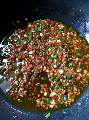 等炒出香味时,把蒜蓉酱跟甜蜜酱放上再翻炒一下,记得同样要炒出香味