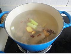 另起锅加入大料、葱段、姜片和花椒煮开,然后将煮好的排骨重新放到锅中大火烧开后转小火慢炖半个小时。
