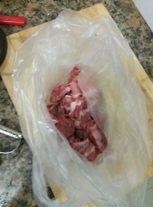 排骨洗干净,放料酒,姜,一点点醋。放进高压锅内。