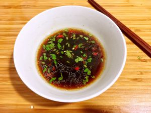 一起放入小碗,加入少许味极鲜酱油和一点香油,再从烧开的炖锅里舀适量带浮油的汤,搅拌均匀,蘸碟制成。