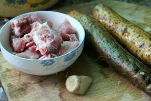 排骨洗净,锅里烧水加葱、姜、料酒焯水5分钟,捞出洗净备用 山药去皮切小段儿,玉米洗净切小块儿 葱、姜洗净备用
