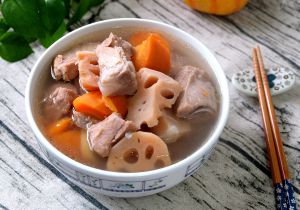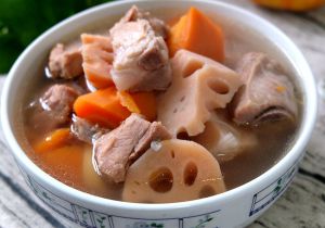 一碗带着胡萝卜和莲藕的清香味的排骨汤就做好了。肋排上的脆骨吃起来很过瘾。