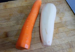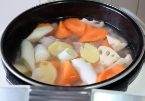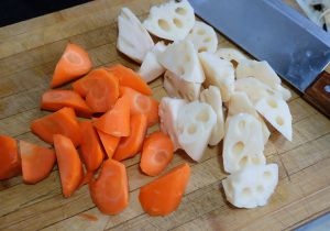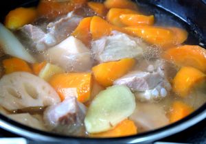 加入切成块的胡萝卜和莲藕,大火烧开后,转小火盖锅盖继续煲。