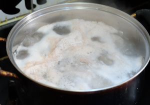 要撇掉所有浮沫的话需要一些耐心。 但是必须要撇掉,因为浮沫是猪肉以及猪骨组织中残留的血液,油脂和杂志,虽然没毒,但是影响口感和卖相。