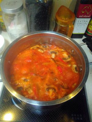 【煮海鲜】 放入草菇中小火煮10钟,不喜欢吃也可以不放,然后放入辣椒膏搅均,然后放入蛤利煮开口后放入虾,也可根据喜好加入鲍鱼、扇贝等其他海鲜煮熟。