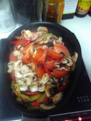继续加入番茄、菇、鱼露、少量盐,因为鱼露本来就是咸的,所有盐不要放太多,翻炒,至番茄出汁。