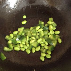 锅中倒入少量橄榄油,下青豆青椒翻炒