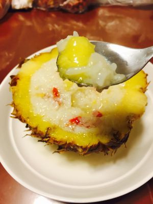 把泡在盐水中的菠萝切成小丁,加入糯米饭中,枸杞、白糖、橄榄油也加入糯米饭中,拌匀后放入菠萝壳里,放到蒸锅里,蒸15~20分钟,就OK啦