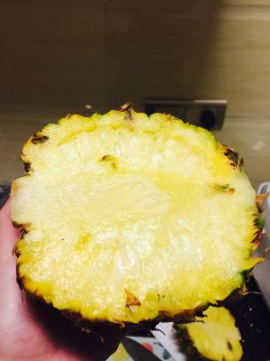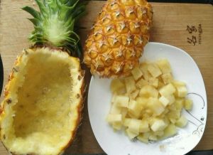 首先把菠萝分成两半,留出一定的厚度开挖果肉,挖好的果肉放入淡盐水中浸泡15分钟