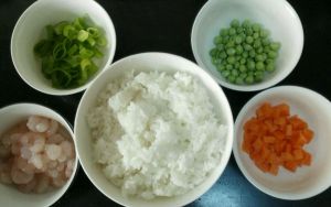 4.锅里放玉米油,依次放入小葱,青豆,胡萝卜丁,虾仁,鸡蛋碎末,炒熟后放入米饭打散,然后放入两大勺椰粉,略炒出锅装入菠萝皮中放入烤箱165度烤5-10分钟即食!