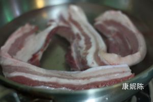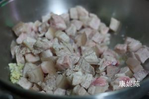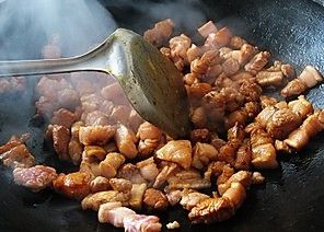 锅里加少许油烧热,把肉块下里面炒,炒到瘦肉变白,肥肉半透明的程度。