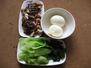 香菇切条,蛋剥皮,油菜对半切开。看看卤肉饭丰富的材料你就了解这饭有多好多营养了^_^