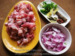 五花肉切成小块,这个肉块要比红烧肉小很多。圆葱切小块。准备葱姜大料香叶和桂皮。