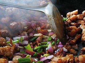 五花肉先入沸水中煮一下~煮到3 4成熟时捞出~切成块~香菇用沸水汆烫后切成末~洋葱切末~