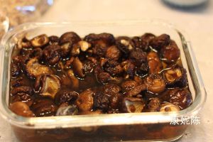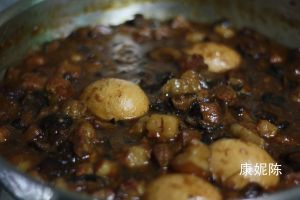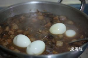 放入浸泡冬菇的冬菇水,再放煮熟的鸡蛋。