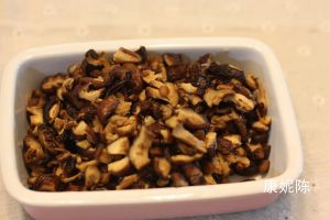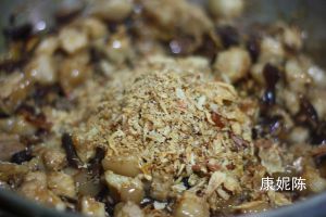 放入黄酒拌匀,然后放入冬菇粒翻炒,再放入油葱酥,拌匀