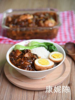 在焖肉的同时煮一锅米饭,盛出一碗白米饭,卤蛋切半,浇上一大勺卤肉和烫熟的青菜,美味的卤肉饭就搞定了。