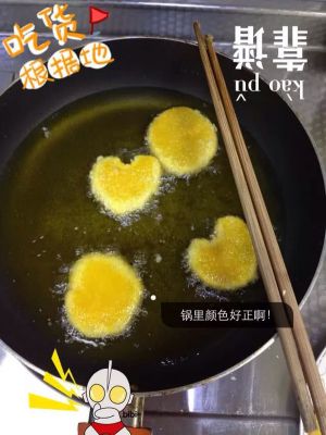 取等量的面团,按包汤圆的方法包入红豆沙馅。包成汤圆后轻轻按扁可在表面沾点面包糠。可以用牙签做不同形状。下油锅煎制。煎的时候注意油温。
