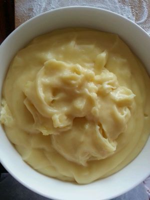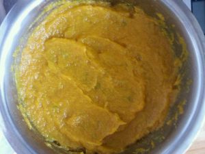蒸好的南瓜倒出多余水分,放入半勺白砂糖,捣成泥。