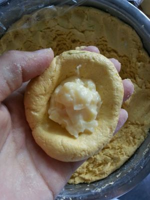 取一面团用大拇指弄个窝加入卡仕达酱馅搓圆慢慢压成饼状