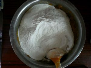 放入200g糯米粉,分多次加入,用筷子搅拌至棉絮状。(糯米粉不固定量,看南瓜的状态,水多粉就要多)