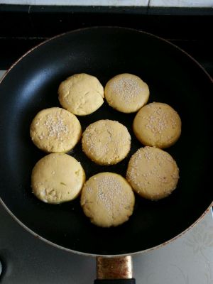 电饼铛多刷油,摆入南瓜饼,3分钟左右,翻面。
