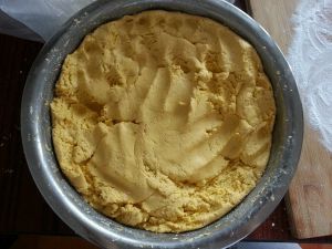 蒸熟的南瓜很软的。随便找个大勺子压压就化了加入面粉 白糖。搅拌一起.. 看不是很软了。开始做造型。你可以找个盖子... 这样可能稍稍有型点。我就这么干的.. 哈哈