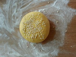 压成饼状后再洒上白芝麻,南瓜饼就等着煎、炸咯!