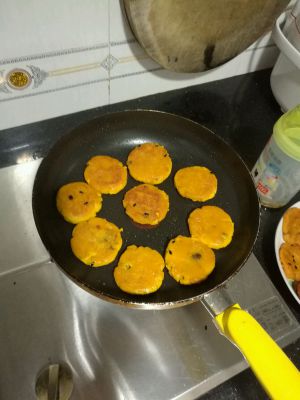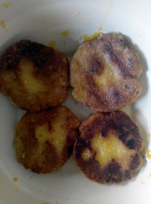 5. 平底锅均匀刷一层薄薄的油,将南瓜饼放锅里两面煎熟即可。